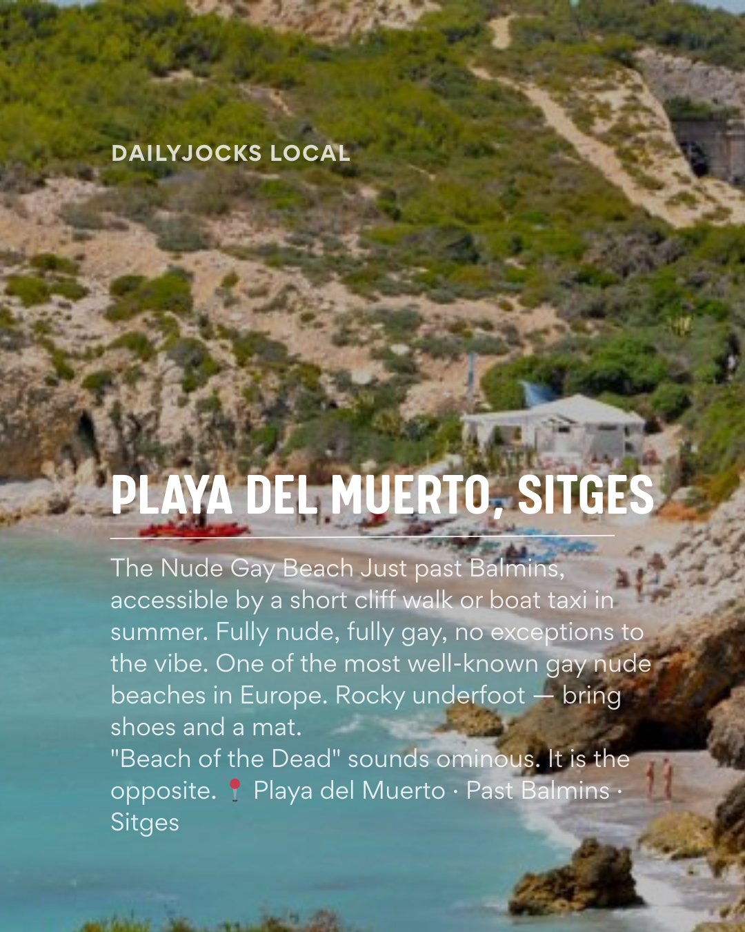 If you're visiting during Circuit Festival in August, expect a very different crowd and energy. The beaches around Sitges during Circuit week are significantly busier and the atmosphere shifts toward a more festival-oriented vibe. Outside of that period, Balmins is one of the most peaceful and genuinely enjoyable gay beach experiences in Europe.